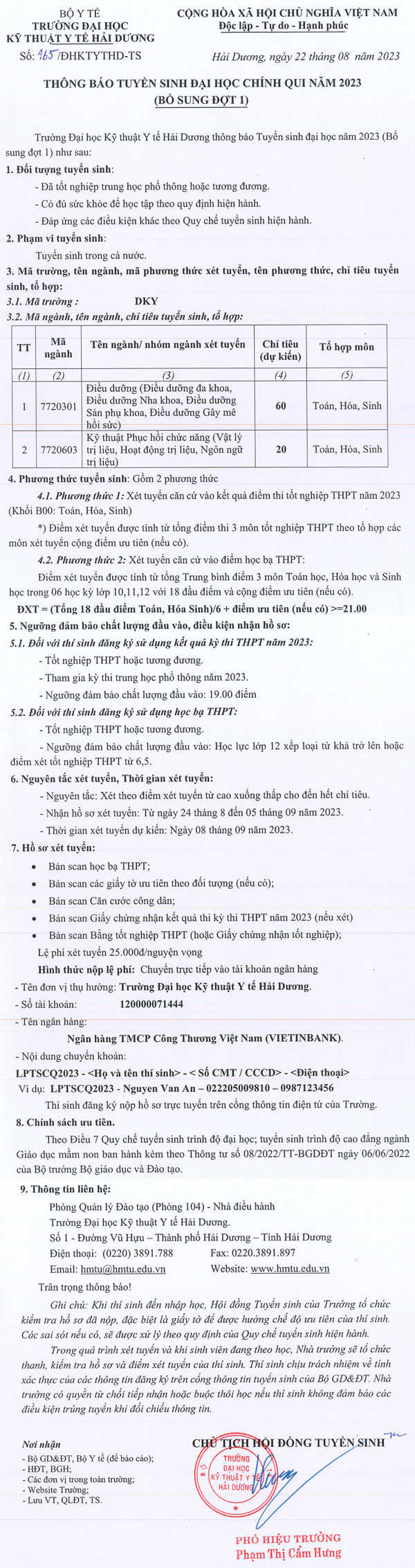 Nguồn: https://thongtintuyensinh.vn/Truong-DH-Ky-thuat-Y-te-Hai-Duong-tuyen-sinh-bo-sung-DHCQ-nam-2023_C319_D19199.htm