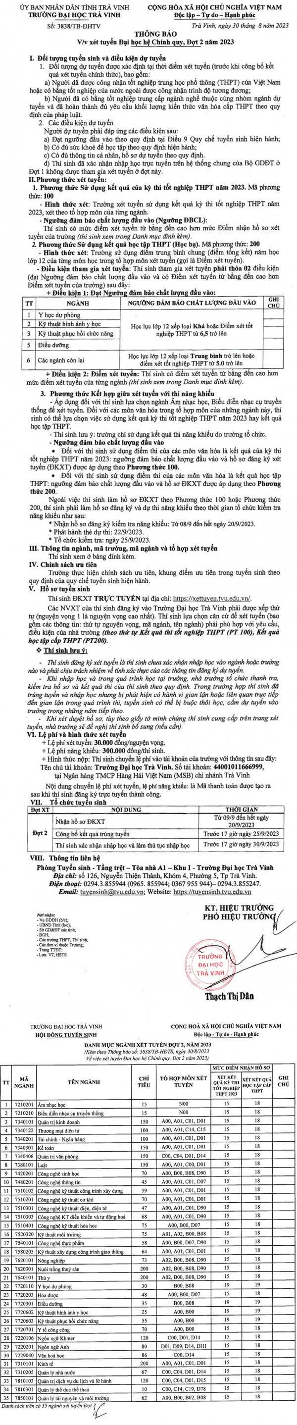 Nguồn: https://thongtintuyensinh.vn/Truong-DH-Tra-Vinh-xet-tuyen-dai-hoc-chinh-quy-dot-2-nam-2023_C319_D19202.htm